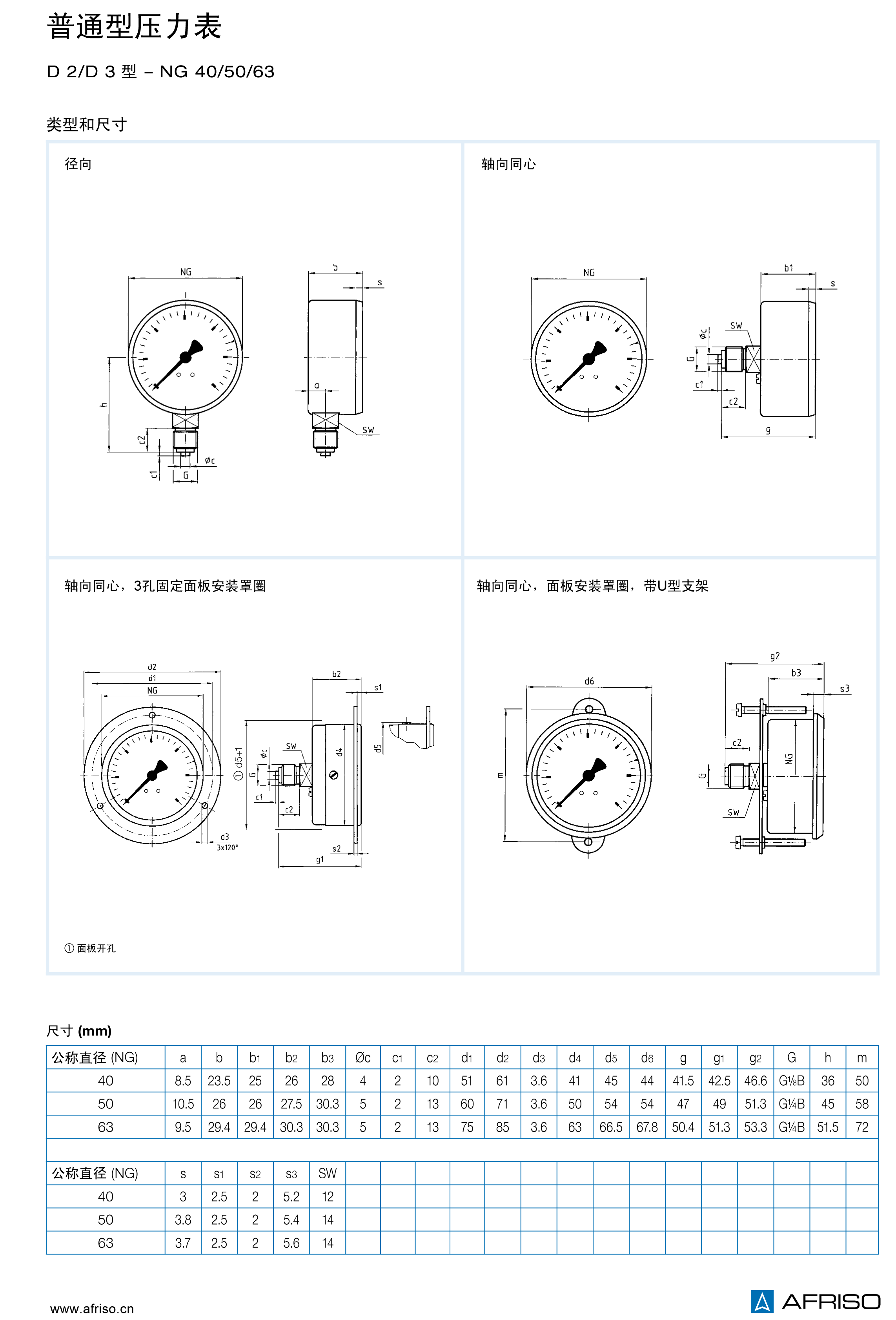 銅合金,徑向或中心軸向 NG 40 G1/8B – SW12 NG 50 – 63 G1/4B – SW14 (EN 837-1/7.3) |