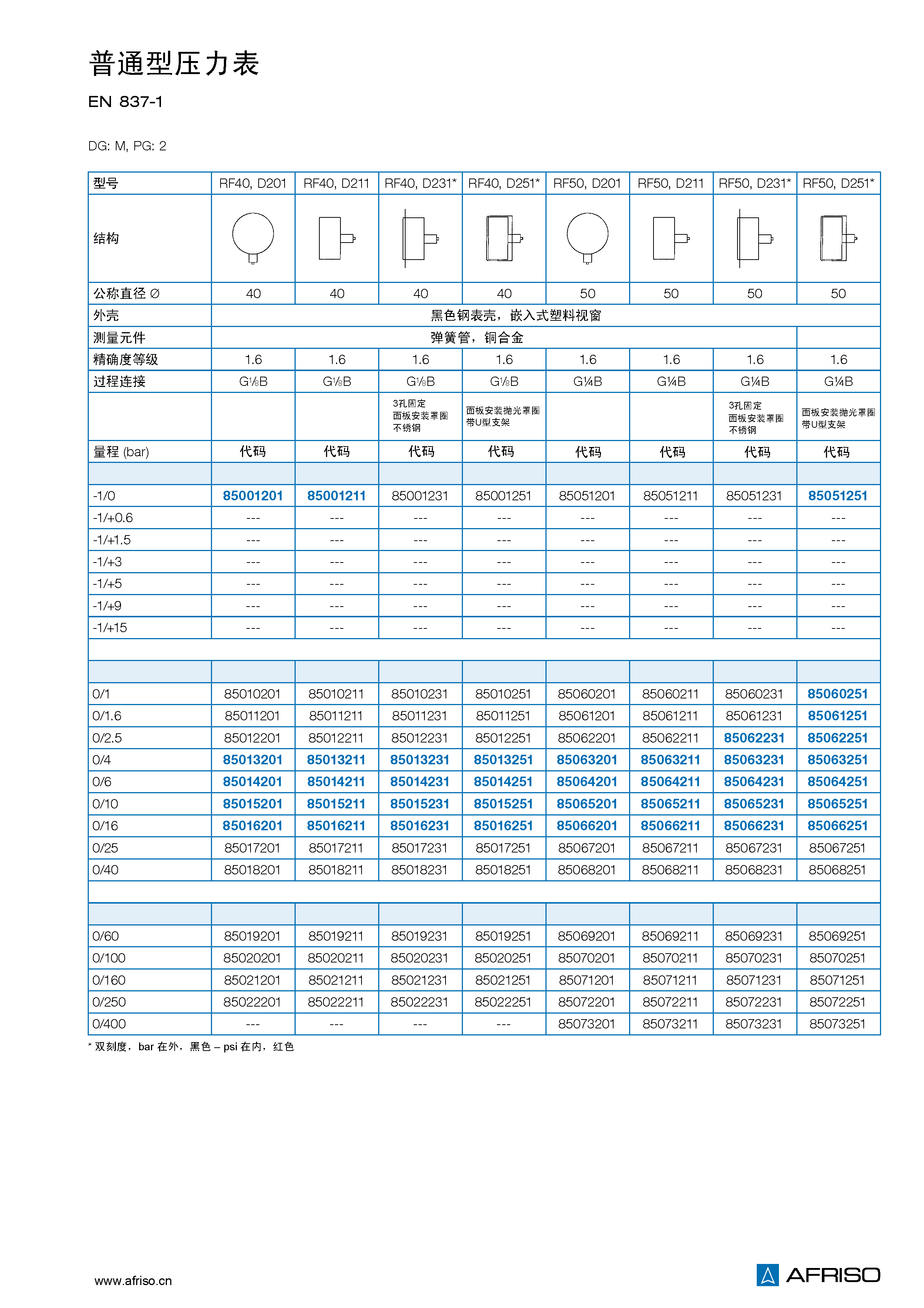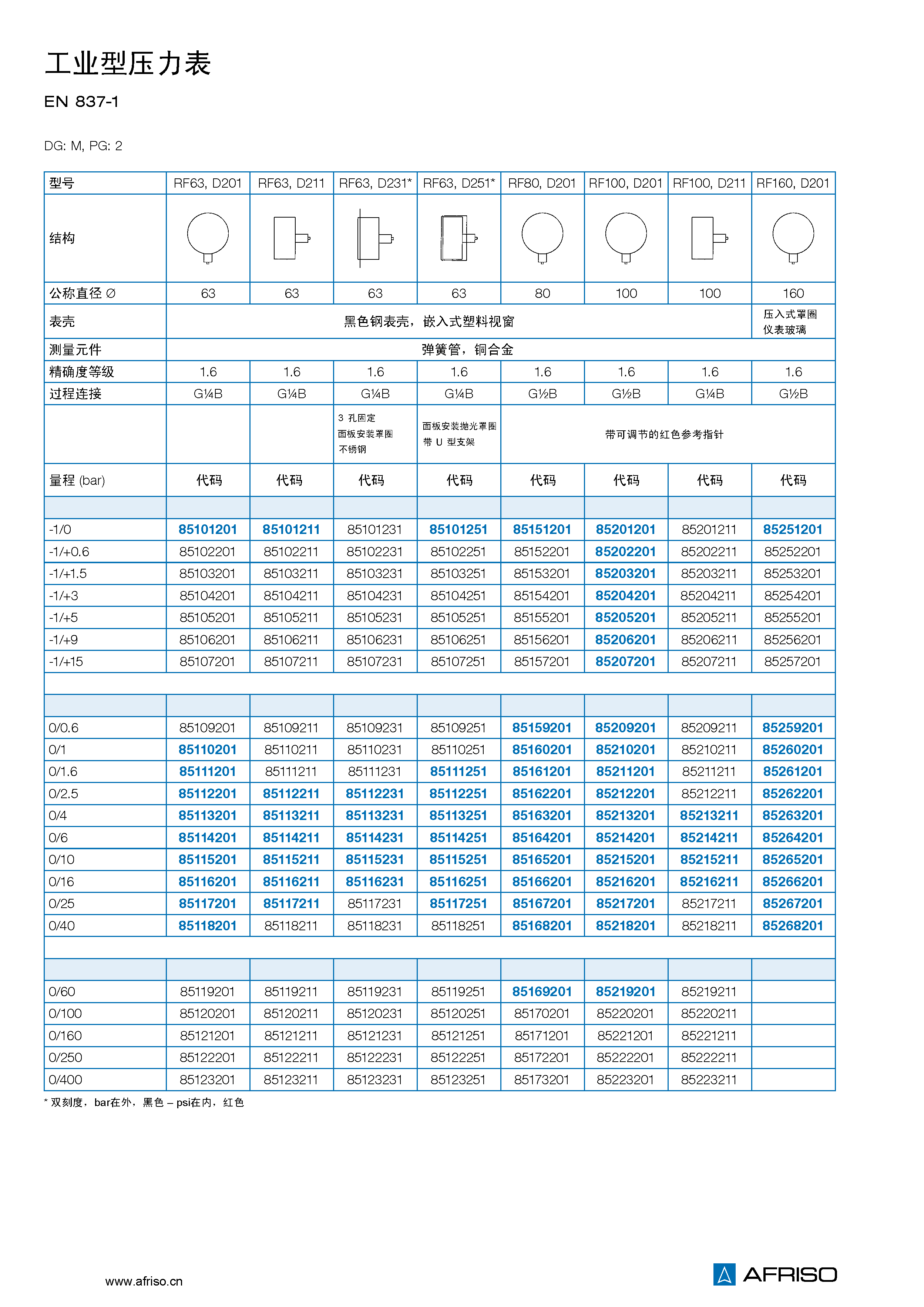 -0.1/0 到 -0.1/+1.5 MPa 0/0.06 到 0/40 MPa |