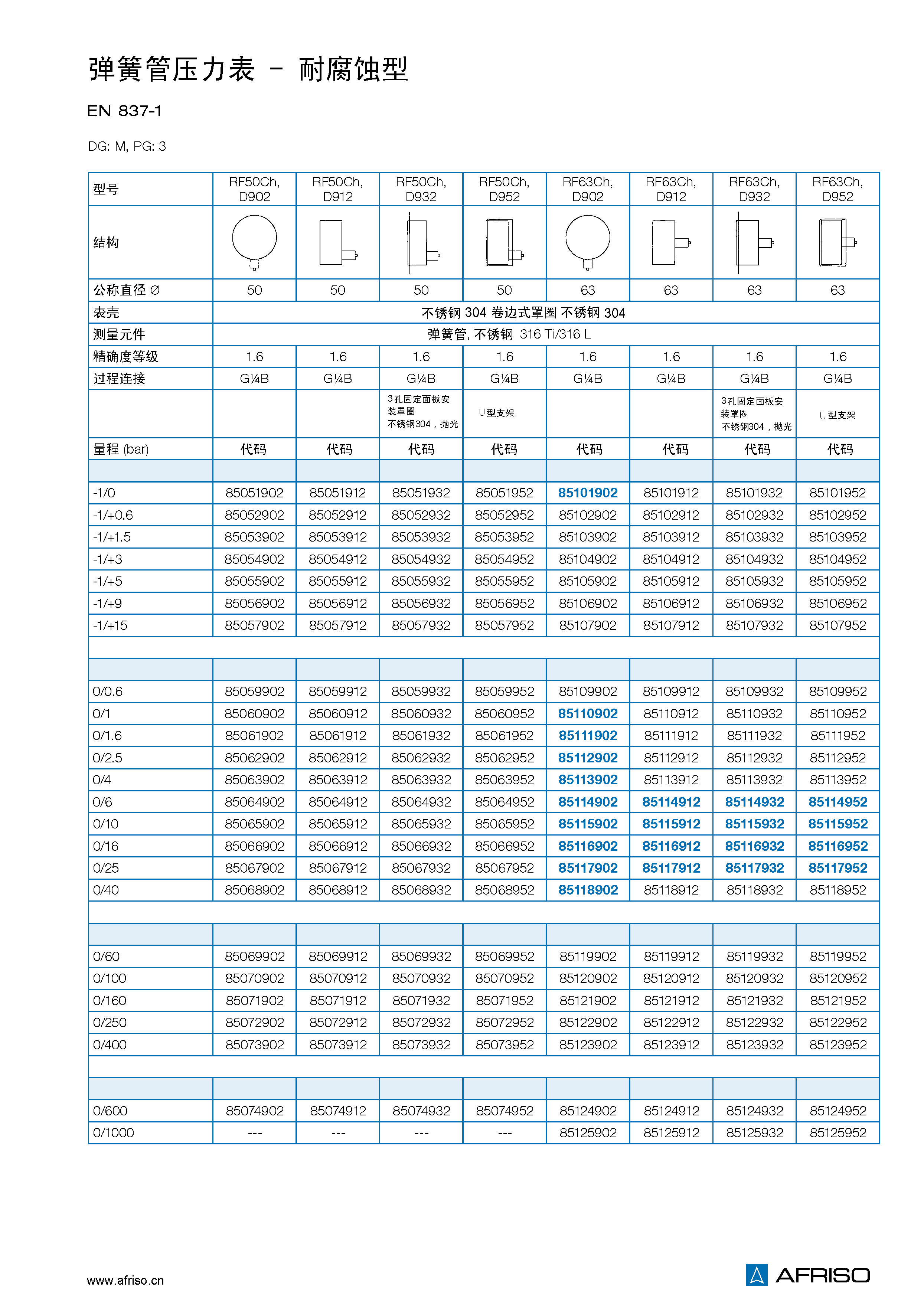 量程 (EN 837–1/5)