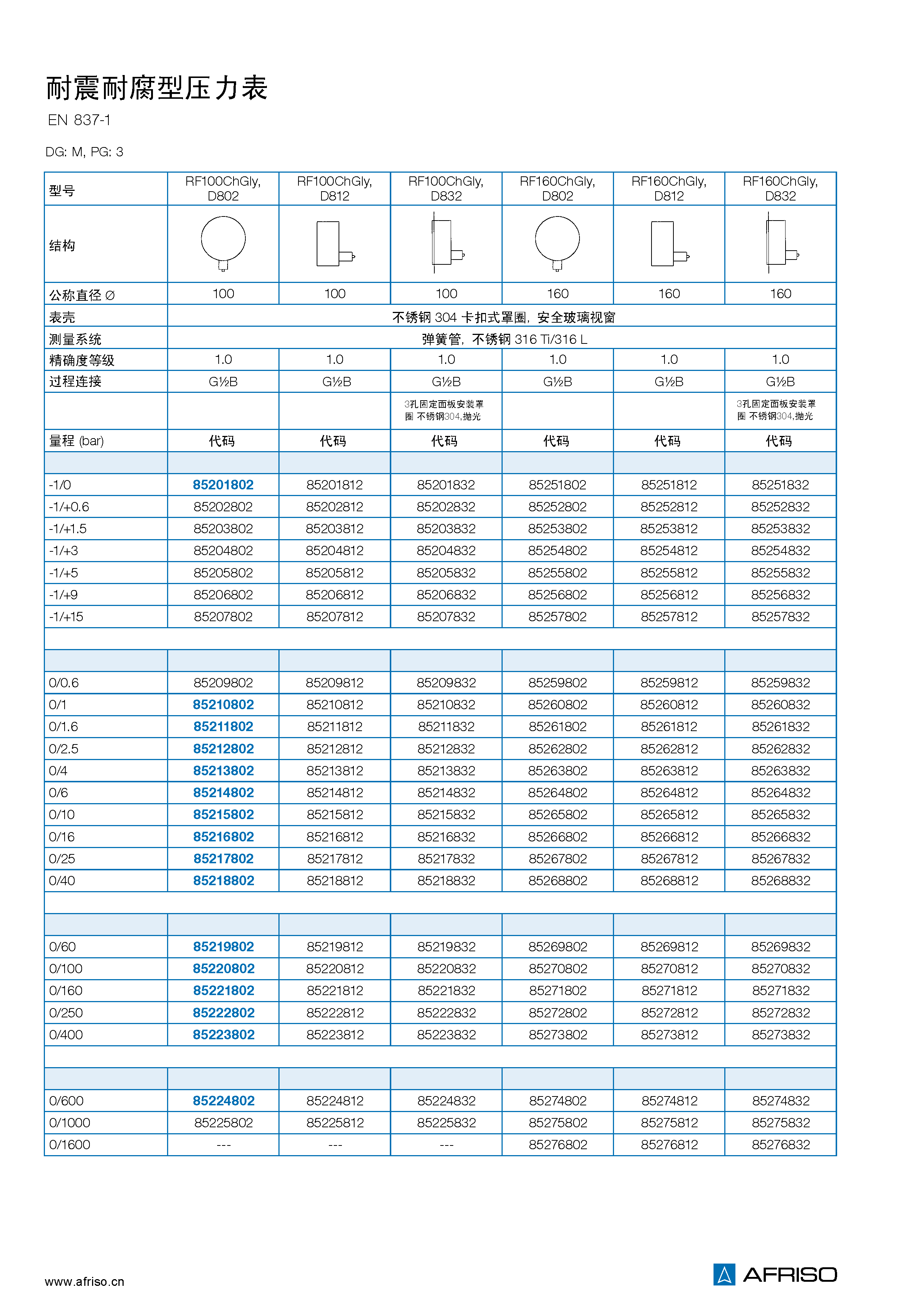 -0.1/0 MPa到-0.1/+1.5 MPa NG 100 0/0.06到0/100 MPa NG 160 0/0.06到0/160 MPa |