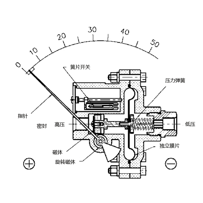壓力作用在被膜片隔開的兩個壓力腔內。如果兩壓力腔的壓力有差異,膜片通過一個磁鐵頂著彈簧產生位移,這個位移通過裝在指針座上的電磁線圈傳遞給指針。壓差直接由指針指示。